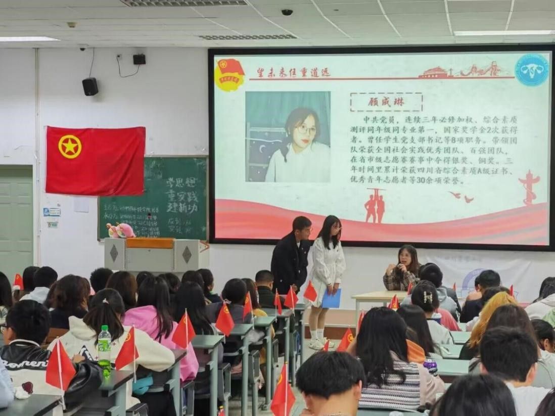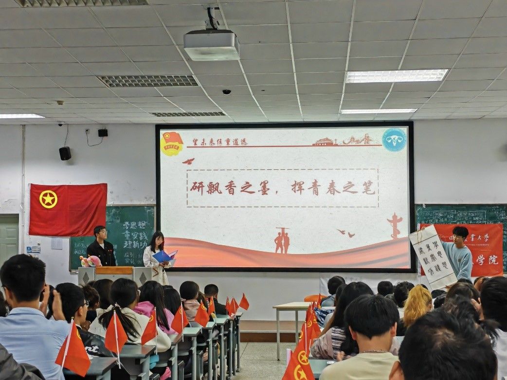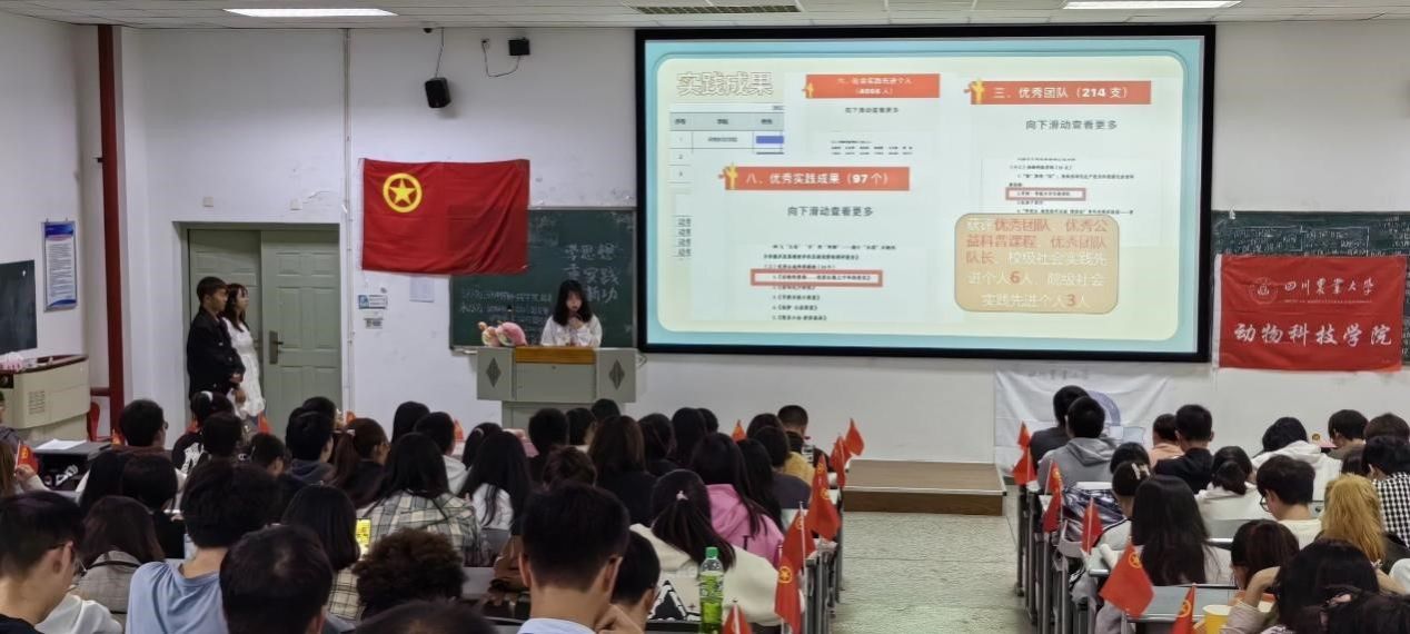 为深入开展学习贯彻习近平新时代中国特色社会主义思想主题教育,加强对广大团员和青年的政治引领,不断铸牢对党忠诚、坚定理想信念、发扬斗争精神、勇于挺膺担当的目标任务。动物科技学院团委直属部门流动团支部、动物科学202201团支部、动物科学202203团支部、动物科学202205团支部、动物科学202305团支部、水产养殖学202302团支部于10月25日在4-A206联合开展“学思想 重实践 建新功”示范性班团活动。本次示范性班团活动通过忆往昔峥嵘岁月、看今朝潮起潮落、望未来任重道远三大篇章展开,共计180余名师生到场参与。