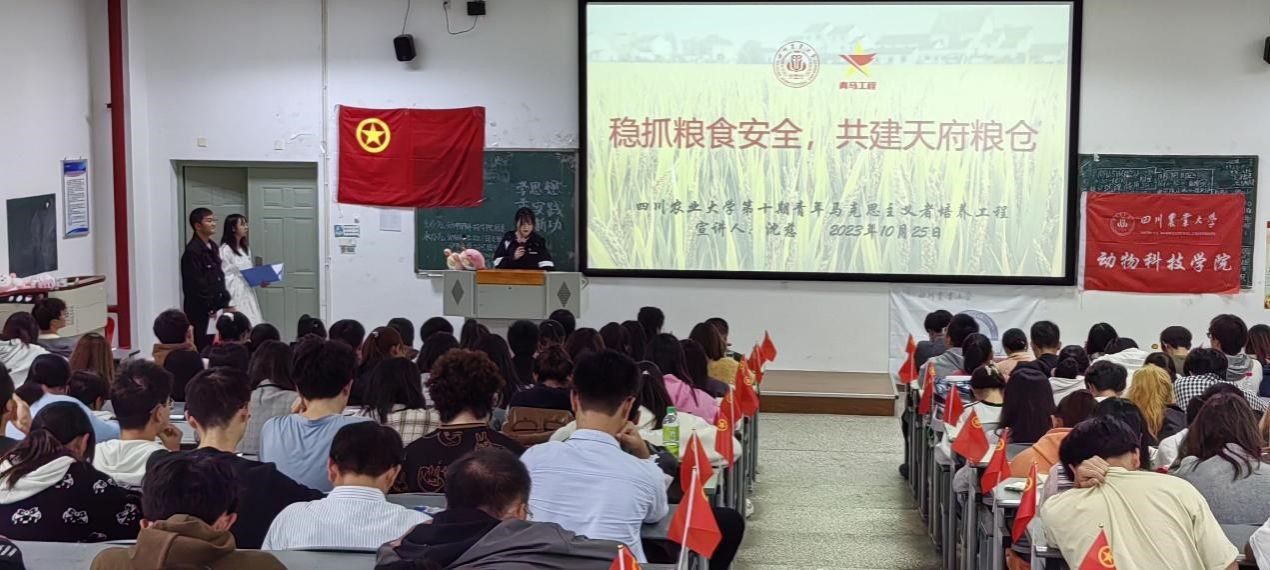 保天府粮仓,护民生安全。校青马班学员沈慈在现场开展以“稳抓粮食安全,共建天府粮仓”为题的宣讲,体现党对于民生问题的保障和“为人民谋幸福”的初心。