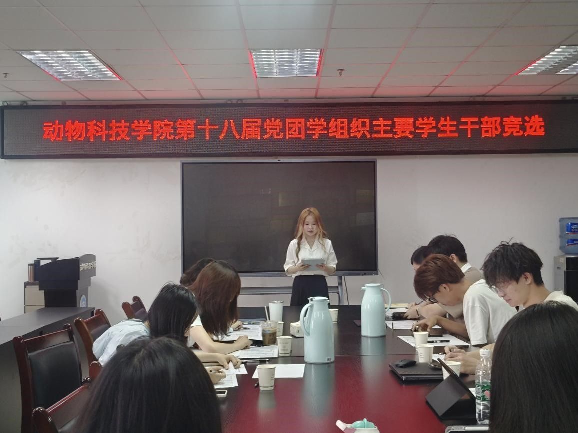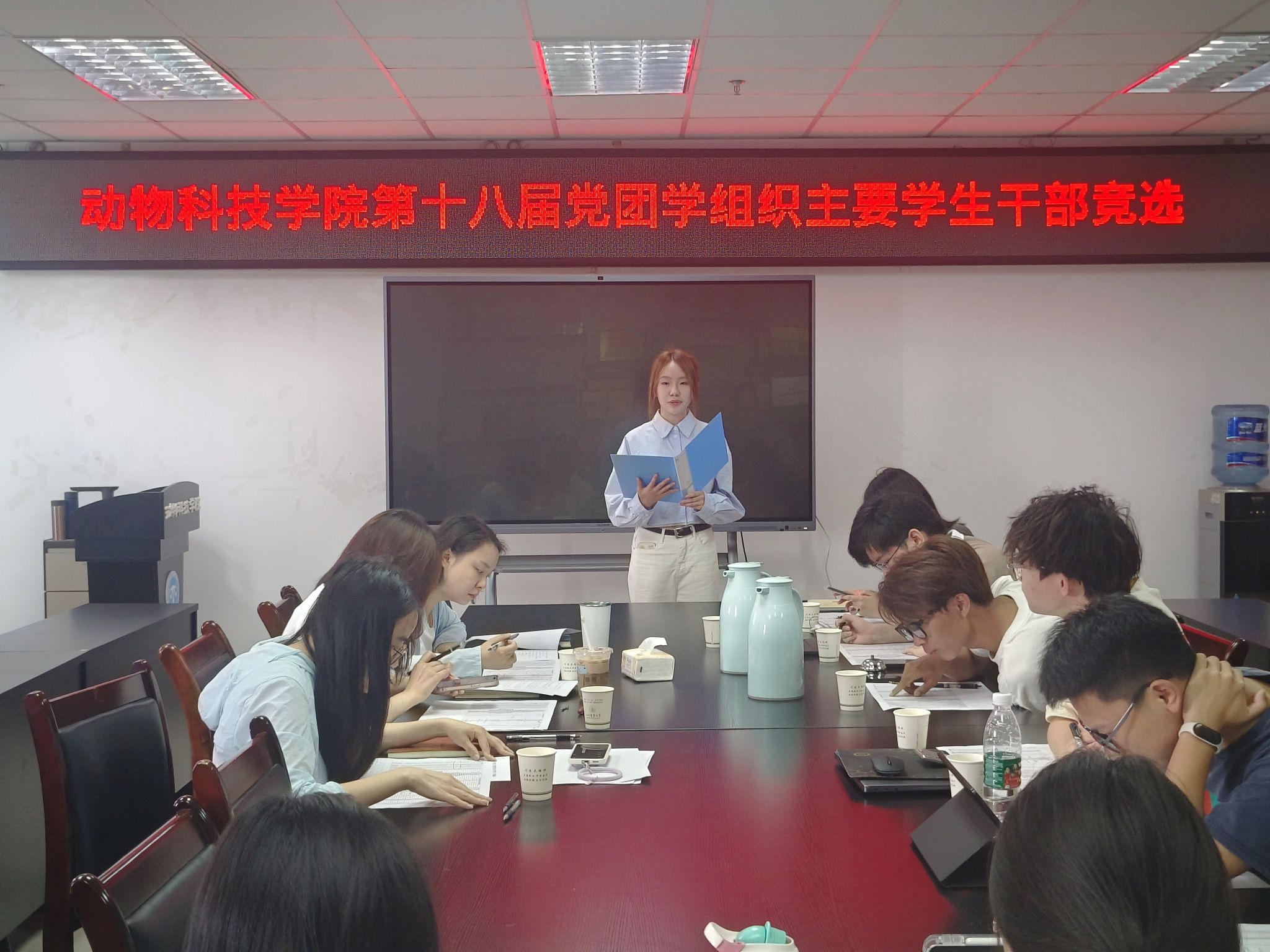 5月18日,动物科技学院在七教1011会议室进行第十八届党团学组织主要学生干部竞选答辩。此次竞选旨在选拔政治立场坚定、品学兼优、组织能力强、富有创新精神的学生干部,以进一步推动学院党团学工作的蓬勃发展。院党委办副主任、团委副书记舒正悦,党委办公室张营营、成蓥参加。