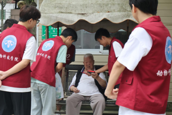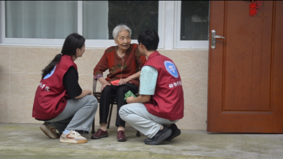 四川农业大学动物科技学院的志愿者正在陪老人聊天。通讯员唐楚嫣摄