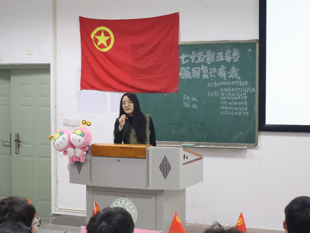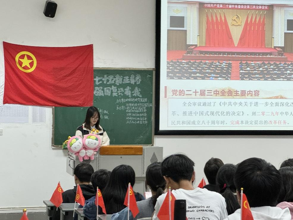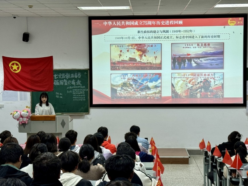 为深入学习贯彻习近平总书记在庆祝中华人民共和国成立75周年招待会上的重要讲话精神,激励广大团员和青年肩负起为中国式现代化挺膺担当的青春责任。动物科技学院团委直属部门流动团支部、动物科学202401团支部、动物科学202404团支部、动物科学202405团支部、动物科学202406团支部及水产养殖学202401团支部于10月29日在4A-203教室联合举办了“七十五载正青春,强国复兴有我”十月示范性班团活动。本次示范性班团活动分为四个篇章展开,共180余名同学参与。