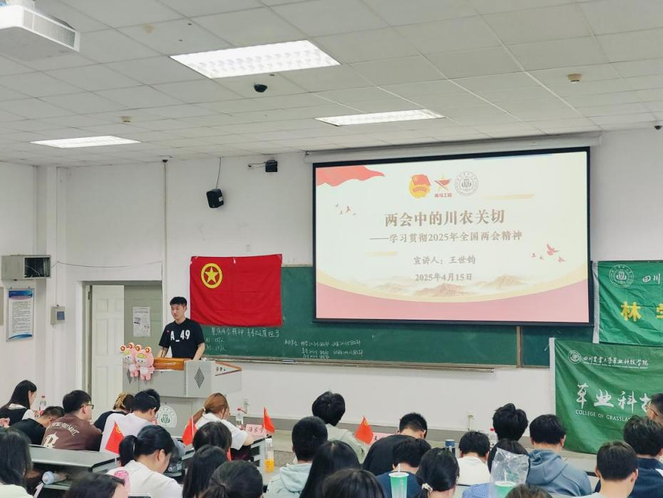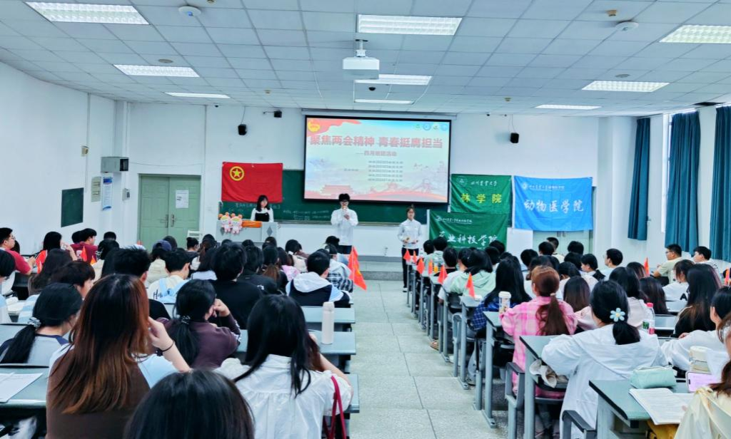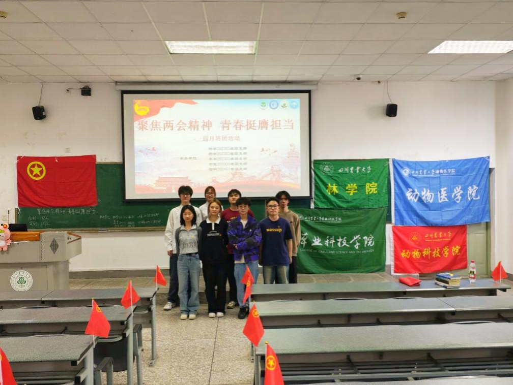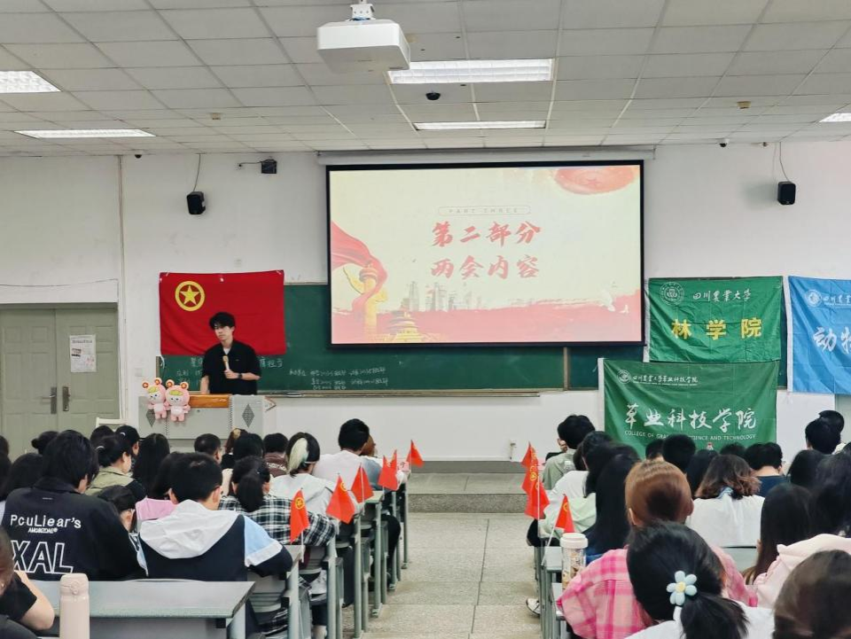 为深入学习贯彻习近平总书记全国两会系列重要讲话精神与重要指示,坚持用习近平新时代中国特色社会主义思想铸魂育人,激发青年团员奋进力量与创新激情,4月15日,林学202303,草学202303,药学202303,动物医学202305,动物科学202401五个团支部于4A-209联合举办了主题为“聚焦两会精神,青春挺膺担当”的班团活动。