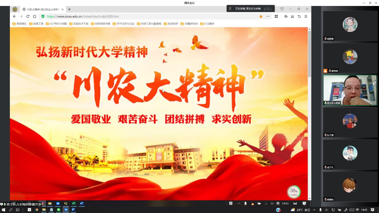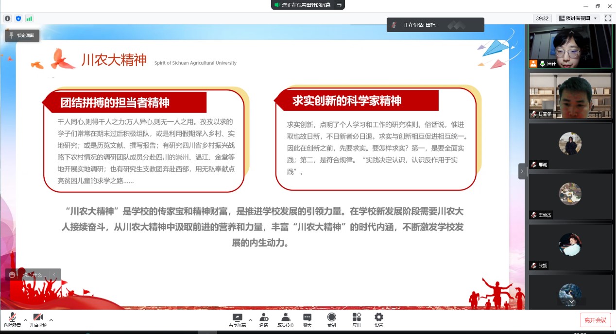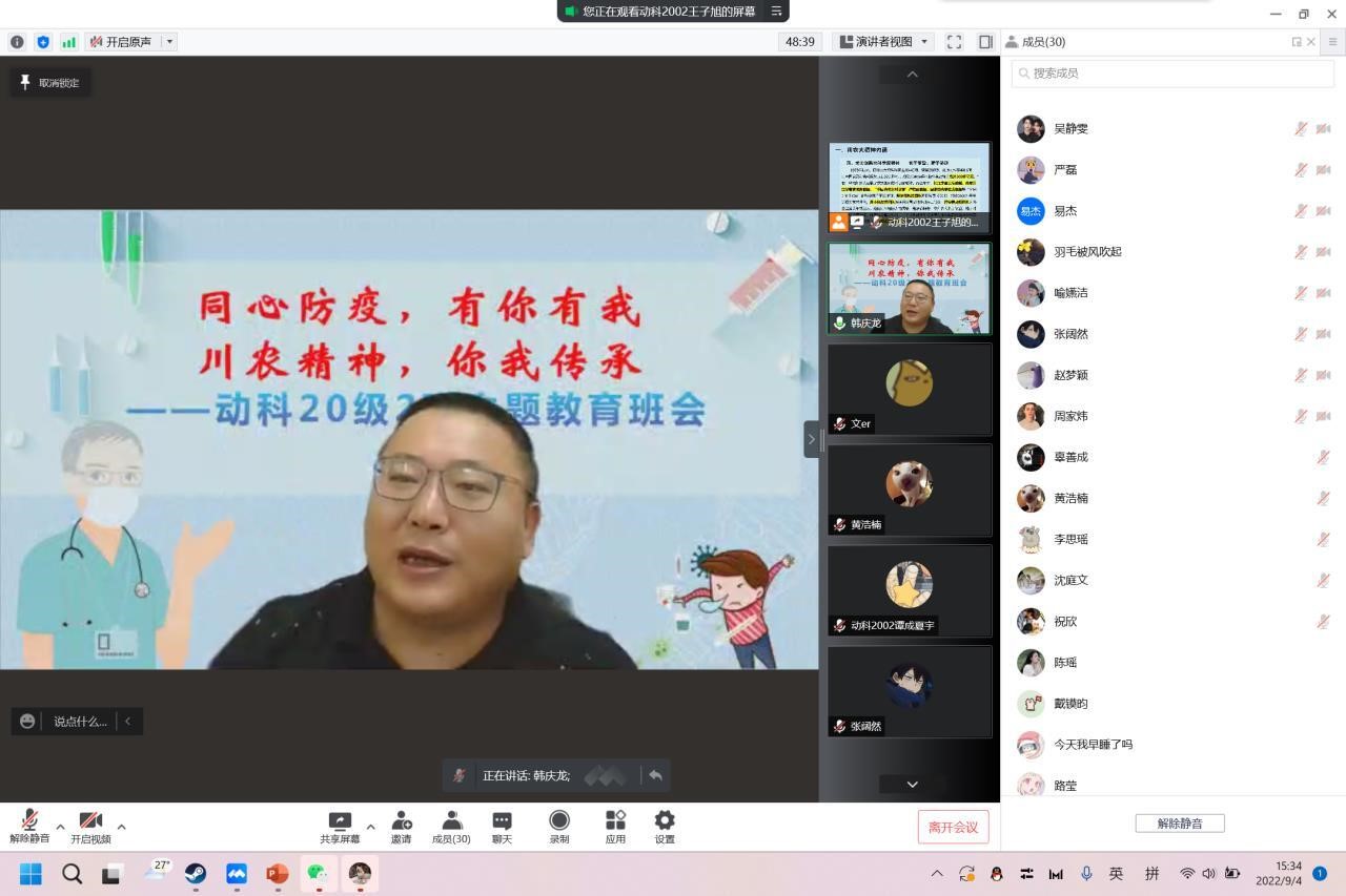 在当前严峻的疫情防控形势下,9月4日-6日,动科学院本科全体小班(包含2022级新生小班)于线上召开了“同心防疫,有你有我,“川农大精神”,你我传承”的主题班会。