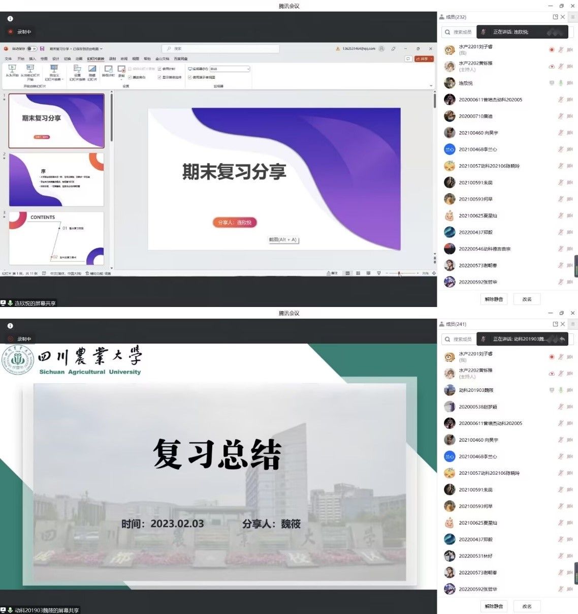 寒假复习系列活动共有复习打卡、考前分享会、学科问题互助三个部分,总计310名同学积极参与,占动科学院延考同学的43%。通过22天的认真复习,最终水产202202班获得一等奖,动科202204班和动科202103班获得二等奖,动科202101、水产202201和动科202106三个班获得三等奖。