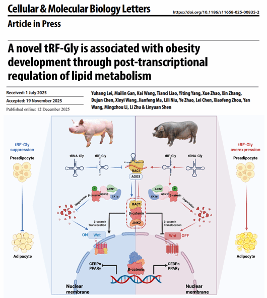近日,动物科技学院朱砺教授团队在tRNA衍生小RNA(tsRNA)调控猪脂肪沉积的表观遗传机制研究领域取得重要进展,相关成果发表于国际权威期刊Cellular & Molecular Biology Letters(IF = 10.2,一区TOP)和Journal of Biological Chemistry(自然指数期刊)。猪脂肪沉积能力与猪的屠宰率、瘦肉率、肌内脂肪含量等重要紧要经济性状密切相关,其精细的遗传调控机制挖掘是猪遗传育种领域的研究热点。近年来,除经典转录因子和信号通路外,tsRNA作为一类新型小非编码RNA,被认为在表观遗传调控中发挥重要作用,但其在猪脂肪组织中的来源特异性、生物学功能及分子机制仍有待深入阐明。