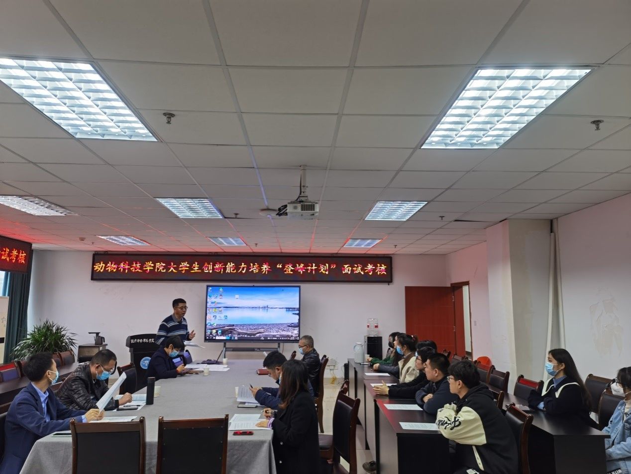 在选拔考核会上,朱砺首先向申请学生和指导老师详细介绍了《动物科技学院大学生创新能力培养“登峰计划”实施方案》细则,鼓励同学们提早进实验室开展科学研究,早积累早出成果,提早完成本硕博学业。随后,申请学生通过自我介绍、英语阅读以及综合能力等方面进行一一展示,考核小组成员对申请学生的英语能力、科研思维实践创新能力以及综合素质等方面进行了现场考核打分。最后,考评小组根据学校和学院的“登峰计划”实施方案中规定考核方式,即考核成绩由学生课程成绩*50%+面试成绩*50%组成,面试成绩由自我介绍、英语能力和综合能力测评等方面构成。在限额范围内,经公示无异议后,由考核成绩从高到低择优录取。