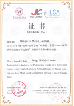 The Jessup, currently in its 63rdedition, is a simulation of a fictional dispute between countries before the International Court of Justice. The Jessup remains the world’s largest moot court competition, with participants from more than 700 law schools in over 100 countries. Normally, students first compete at national level rounds (National Rounds) and winning teams of National Rounds advance to the White & Case International Rounds (Global Rounds), held each spring in Washington, D.C. In turn, National Rounds comprise preliminary and advanced rounds, and the latter include quarterfinal, semifinal, and final rounds. This year the Jessup has been exceptionally held in a hybrid format, mostly online, allowing for the organization of Regional Rounds, in addition to National Rounds and the upcoming Global Rounds. A/Prof Mejía-Lemos has been invited to participate as a judge in the Jessup since 2016, up to National Final Rounds, and has been accorded awards by National Round administrations for his outstanding participation as a judge.